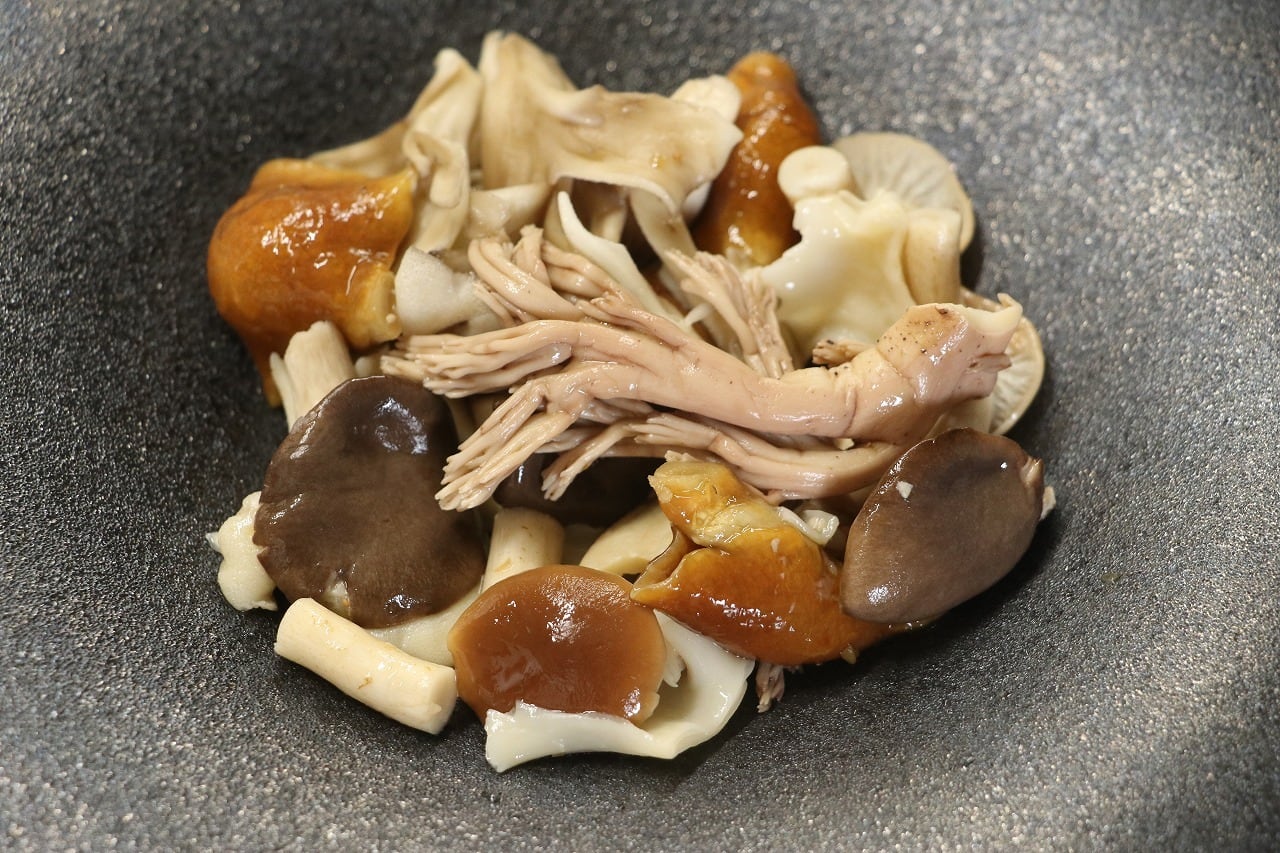 全て解凍し、鍋に鍋出汁を入れ沸き始めたら中火にしきのこを加えます。