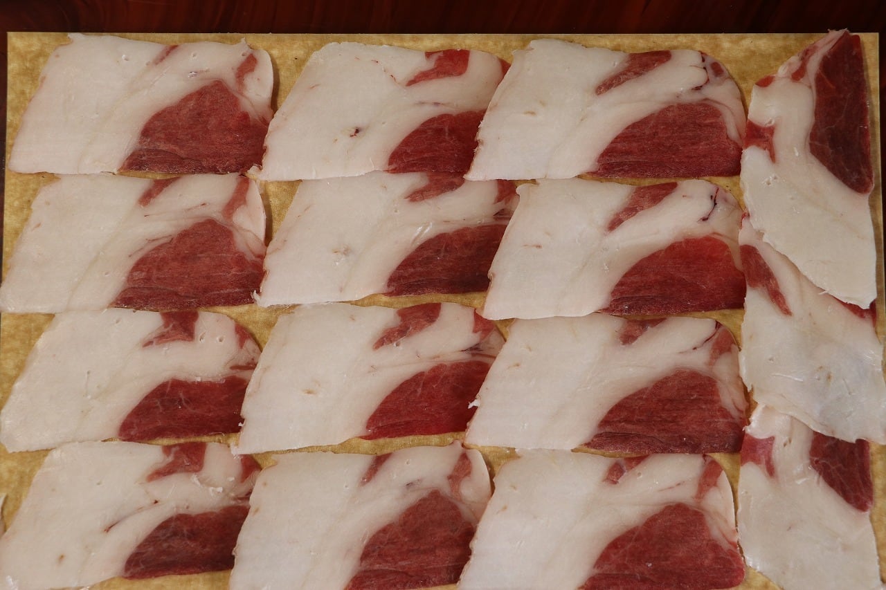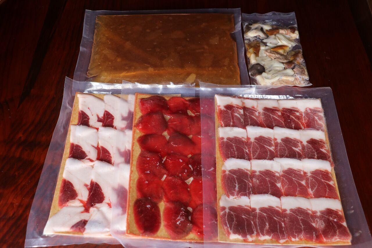 再び沸き始めたらとろ火にして最初に鹿肉は軽くしゃぶしゃぶ感覚でサッとくぐらす程度がお勧めです。アクセントにニンニク醤油や胡椒・一味を少し付けて食べても美味しいです。